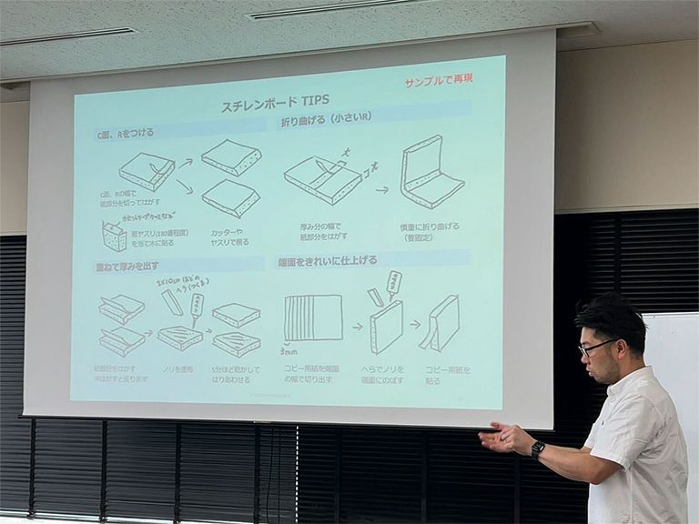 デザインとエンジニアリングの融合による新たな価値創出を意識し、計測機器メーカーのエンジニア向けに、デザインリテラシーの向上を目的としたプログラムを二日間に渡って開催。工業デザインの歴史を振り返りつつ、アイデアスケッチとプロトタイピングの実習を実施。具体的には、戦後から現在に至るまでの、日本のデザイン史を基に、社会における製品開発の潮流と、デザインの役割の変遷に触れた上で、自ら考え、その意図を他者に伝達するツールとしてのスケッチ技術を演習形式で指導。同時に、子細な観察から、機能が成立する構造を見出し、模型を製作しながら設計を進める手法を身に付ける実習を提供。