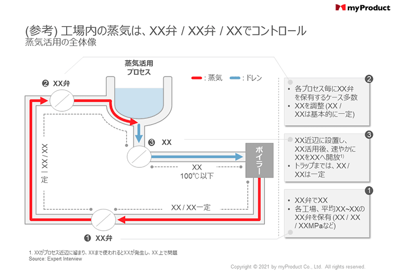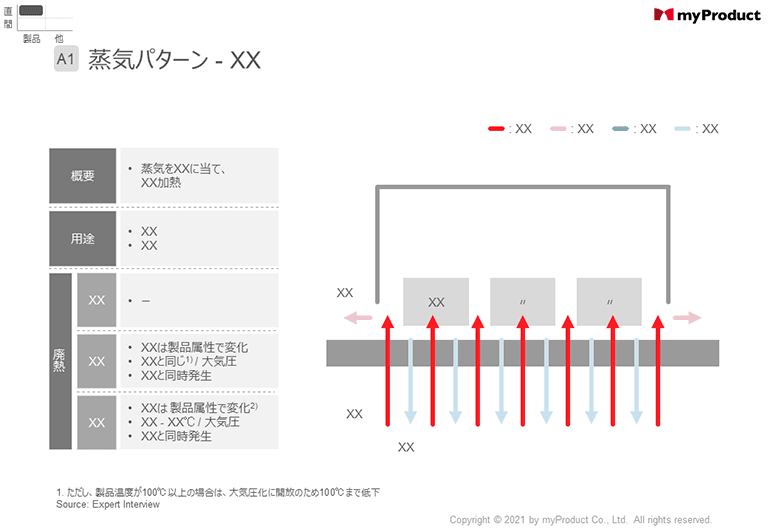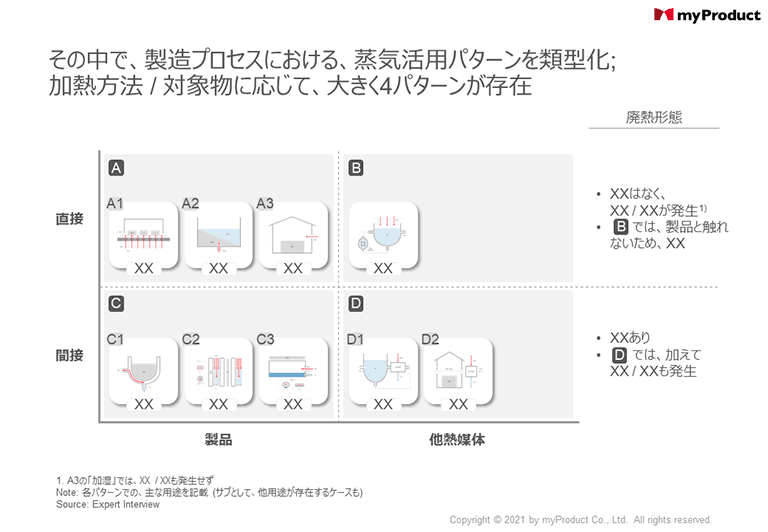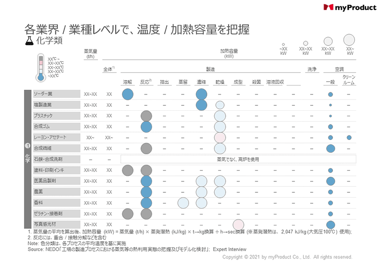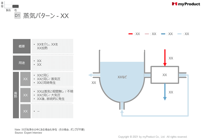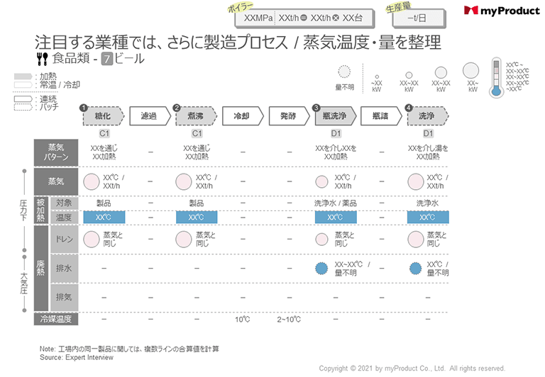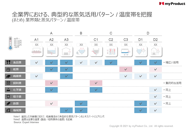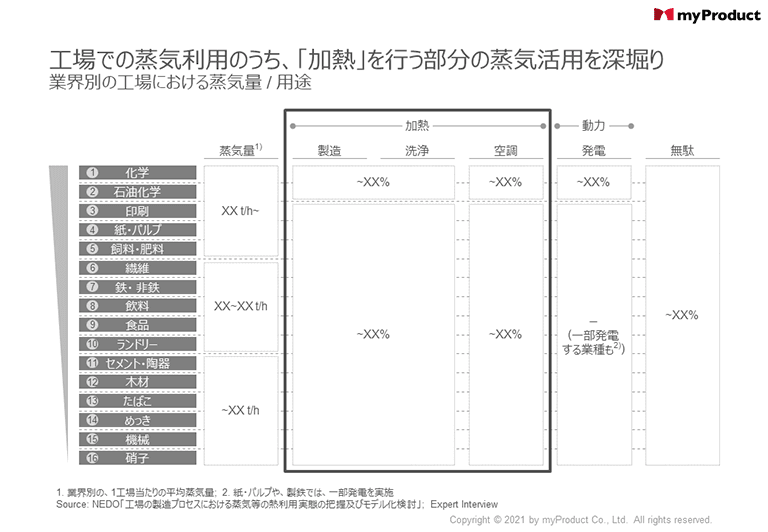 脱炭素化に伴い、化石燃料で蒸気生成している工場では、電動化の流れ。大手メーカーと、変化を活かした新たな事業機会を模索するため、幅広い業界における蒸気活用の現状を調査。多様な用途 / 温度 / 加熱容量を把握し、産業界における典型的な蒸気活用パターンを類型化。パターン毎の廃熱量 / 廃熱形態の差異に着目し、想定される代替品スペック / 潜在市場を把握。