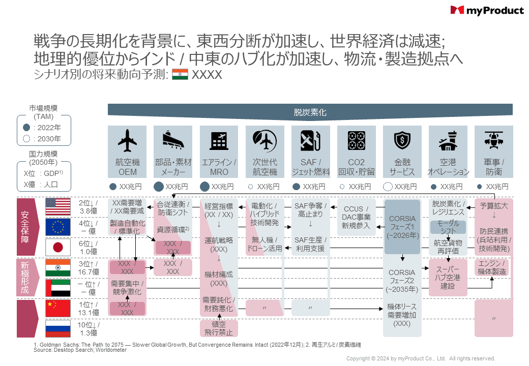 脱炭素化と安全保障を切り口に、地政学リスクと深く結び付いた航空・防衛産業の将来動向について中期的なシナリオ分析を実施。グローバルサウスの台頭や米国の大統領選挙、中国の領土問題など、起こり得る「もしも」を想定し、それぞれの場合の産業における変化と、一部の定量インパクトを分析。最終的に、成果物を一つの「マップ」に仕立て、議論を通じて事業機会仮説の幅出しへ。