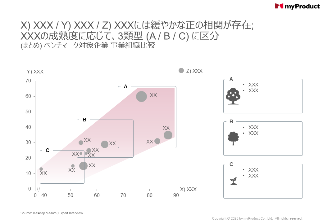 幅広い製品群を提供する大手複合企業において、事業部を跨いだ横串連携を図る事業推進組織の変革に参画。これまで各事業部が主体となって進めてきた顧客向けサービスについて、競合各社はデジタル化 / 定額化などによる囲い込みを強化しており、全社視点での競争戦略の再考を進めるフェーズに合流。当社として、競合各社の取組をベンチマークし、差異を可視化すると同時に、戦略 × デザインのアプローチで部門間の意思疎通・意志決定を支援。支援においては、専用のデザインツールを開発し、国内の複数拠点でワークショップを開催しながら意見集約を行い、施策を共同策定。次年度からの組織変革に適用予定。