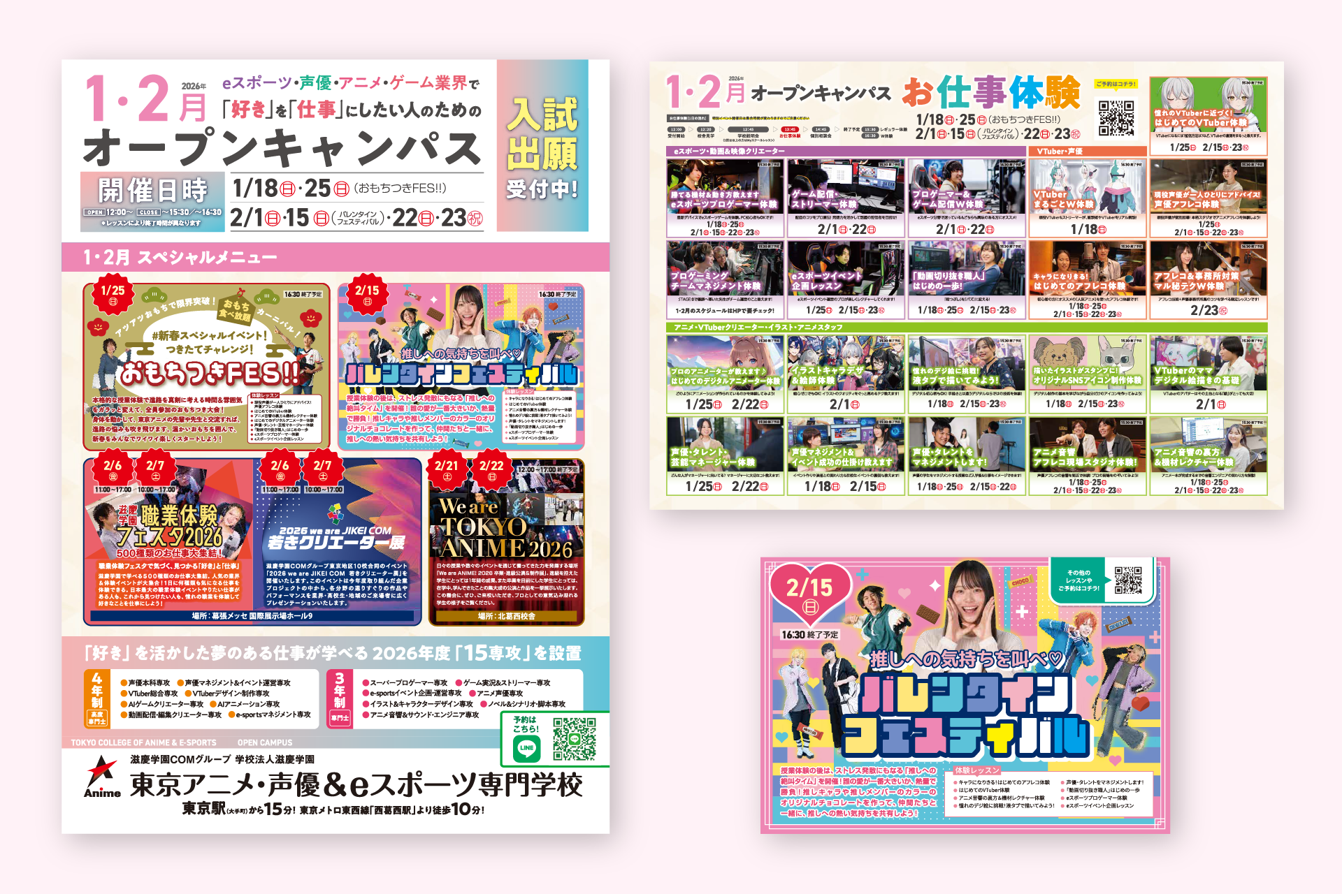 オープンキャンパスの通年開催による、志望者との「接点の薄まり」を課題視するクライアントに対して、冬季特有の学生事情・心理に配慮したDM / ハガキ施策を企画・制作。出願直前の高校3年生には、入試に臨む上での不安を払拭し、進路検討初期の新高校3年生には、「職業体験」による適性への気付きを促す、二段構えの訴求を構築。季節限定イベントをフックに、継続的な接点を通じて志望意欲を維持・向上。