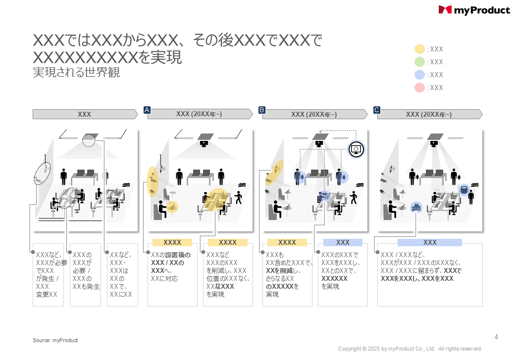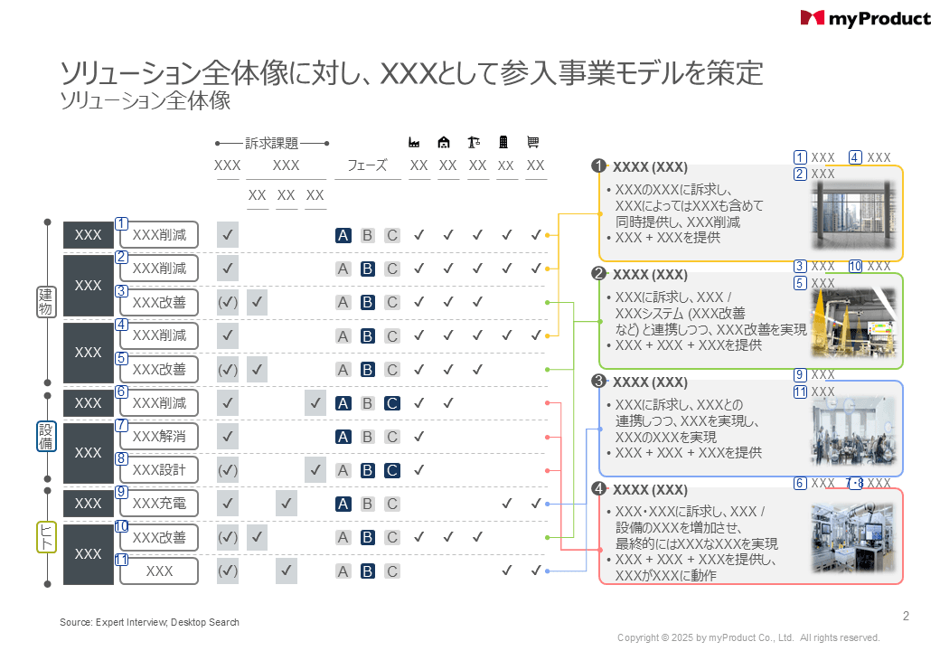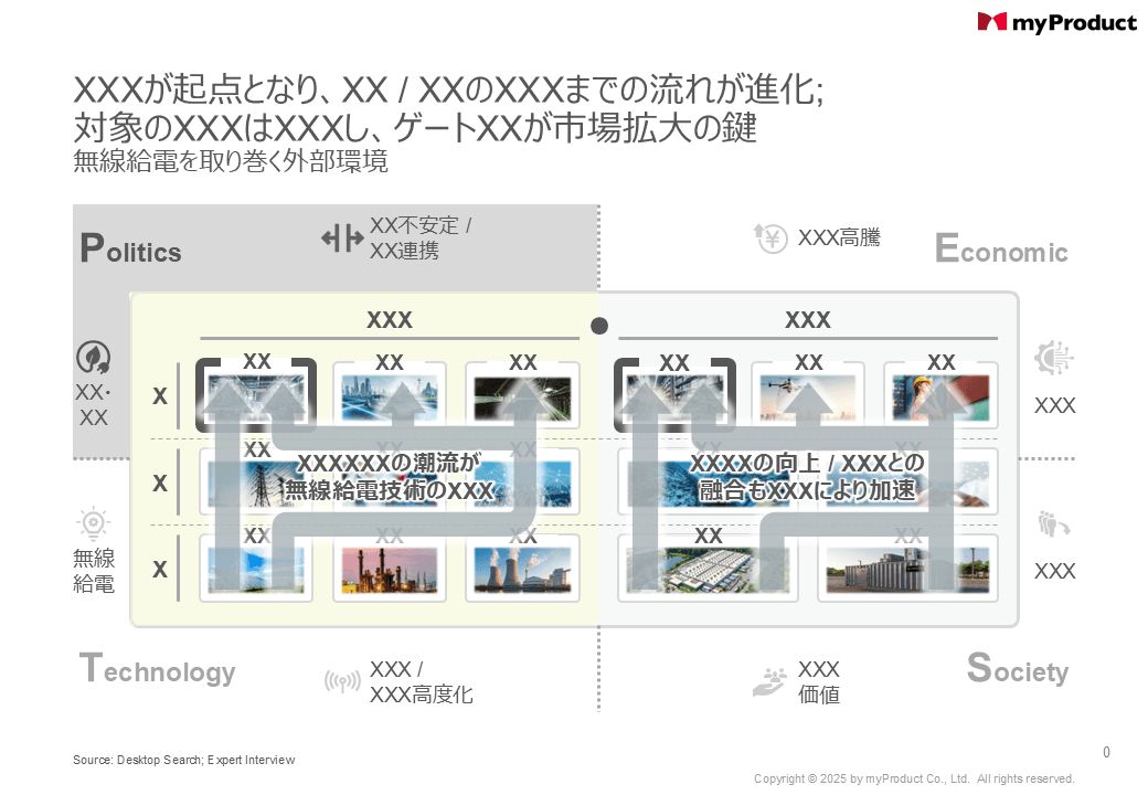 無線給電は屋外のモビリティ / インフラで実証実験が進行すると同時に、屋内でも工場 / オフィスなどで幅広くニーズが顕在化。技術 / 価値検証を踏まえた事業化を想定し、クライアントと共同で国内外の顧客候補 (約20名) に複数回のヒアリングを実施。議論から生じたユースケース (約100件) を基に、情報デザインの手法でペーパープロトを策定し、最終的に最も有望なソリューションを4つ選定。ソリューション単位で事業化に向けたKSFを整理し、競争優位性を担保した事業化仮説を構築すると同時に、無線給電が普及した後の「世界観」をコンセプトペーパーとして描き出し、今後は顧客提案フェーズへ。