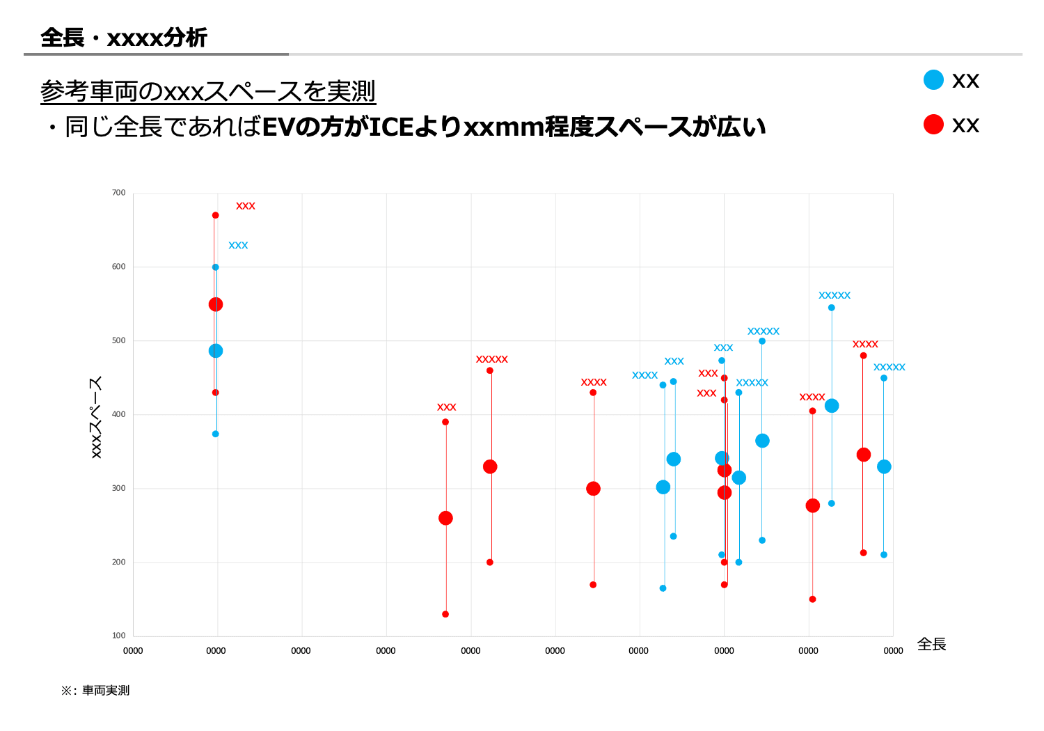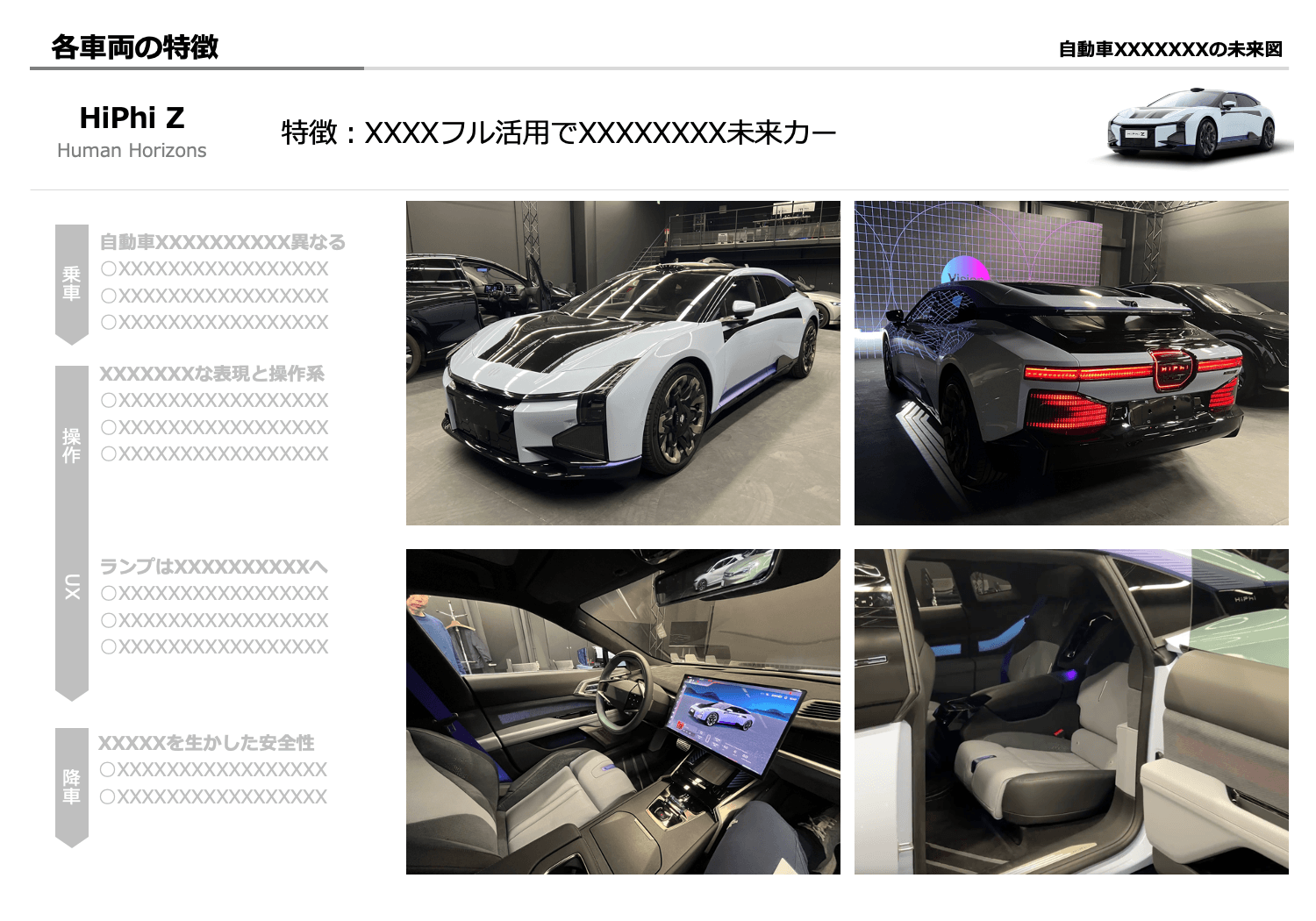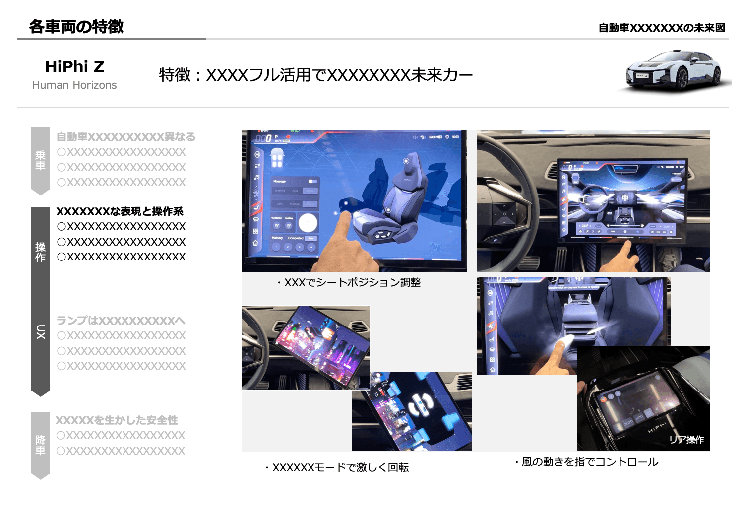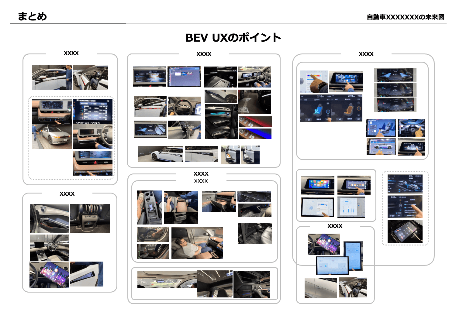 自動車の電動化 (BEV) に伴い、多数のインテリアアイテムが純正化しており、クライアントである自動車部品メーカーでは、BEV向けのアイテム開発に課題感。本調査・提案では、BEVで発生するインテリアスペースをメカニカルレイアウトの知見から予測し、従来のアフターマーケット商材の開発とは異なるアプローチを提示。加えて、中国・韓国・日本のBEV車両をレンタルした上で、BEV時代に必要なUXデザイン調査を実施。