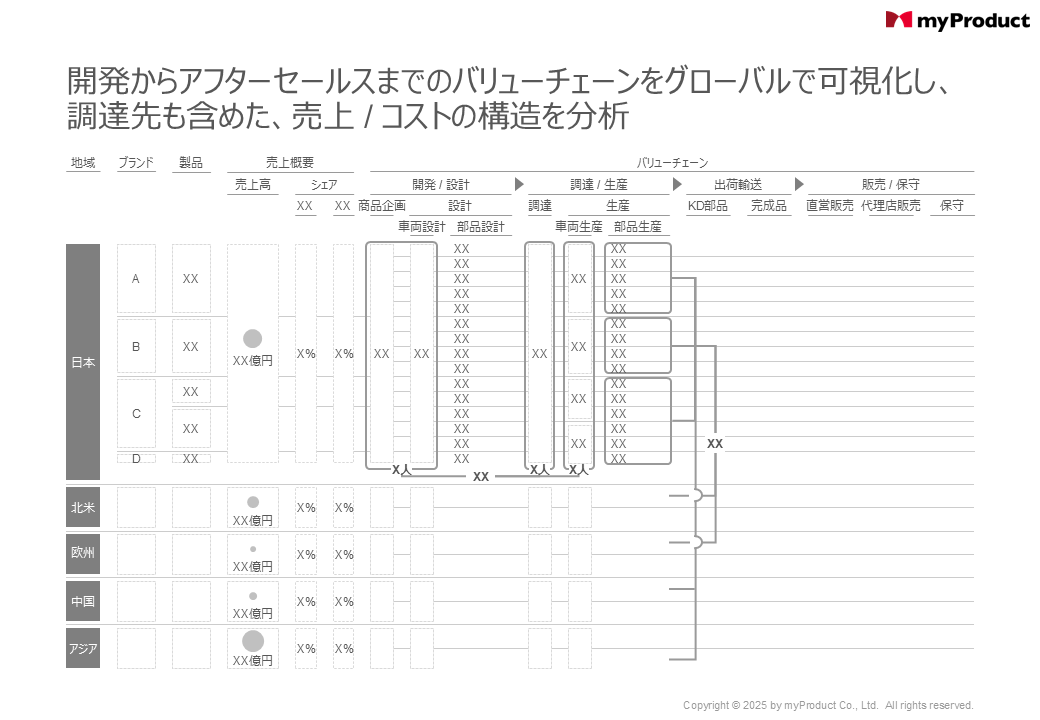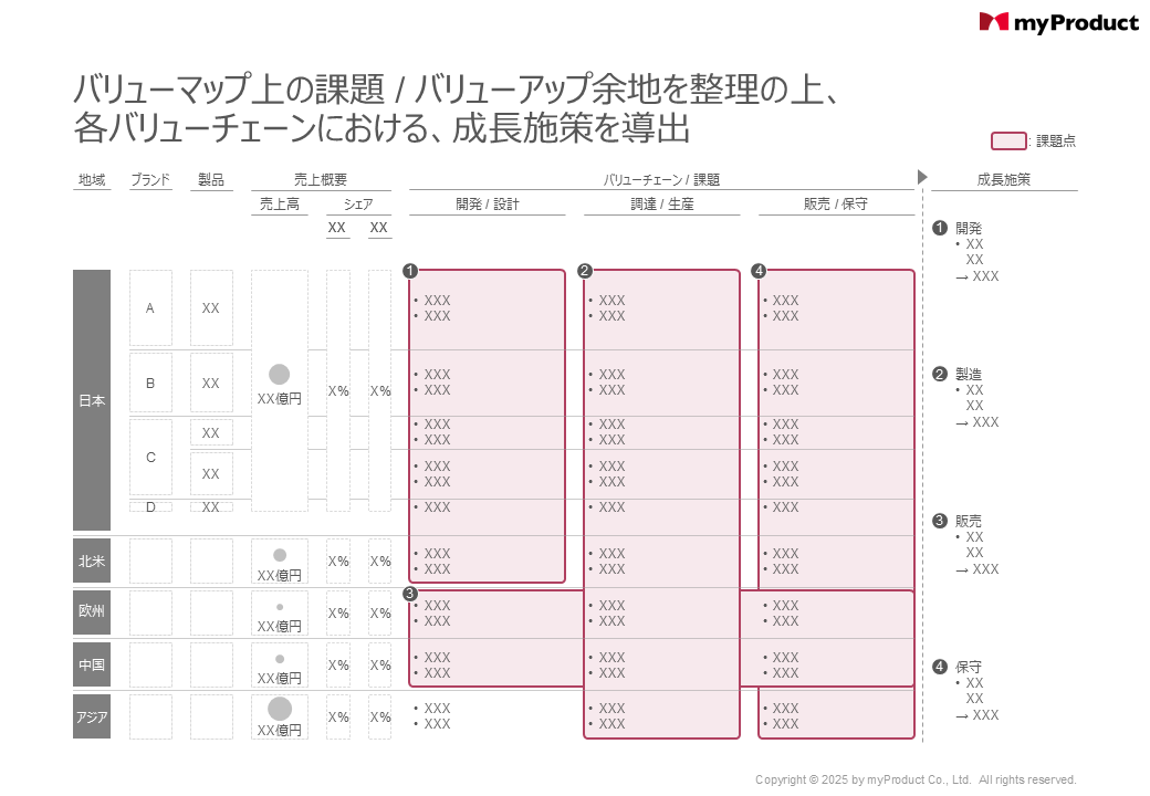 電動化 / 知能化 / 米国関税など、多様な外部環境の変化を背景に、産業機器メーカーのグローバルサプライチェーン再設計を伴走支援。日米欧中亜を対象とした、開発からアフターセールスまでのバリューチェーン上における、売上 / コスト / 提供価値を分析し、現状課題 / 成長機会をバリューマップとして可視化。各成長機会に対応した、10個の成長施策を導出し、収益貢献度を定量的に明確化。CXO間の協議を経て、成長施策の実行フェーズへ移行。