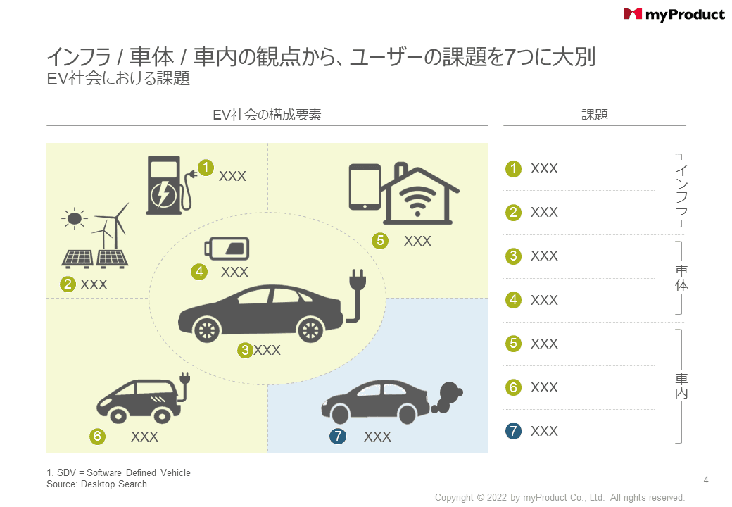 CASEやOTAの進展を背景に、昨今の自動車業界では、HWが価値を失いつつあり、アフターマーケットで車載機器を提供してきた事業者は、製品戦略の見直し局面に。本プロジェクトでは欧州 / 中国を中心に、EVユーザーの視点から、EV普及フェーズにおける悩みや要望を収集し、構造化。現地ならではのSNSやメディアから幅広く情報を取り込み、課題と、ユニークな新規ソリューションを紐付け。クライアントとの議論を経て、自動車装備や充電ステーション周辺にフォーカスし、UXレベルでの製品デザインの検討へ。