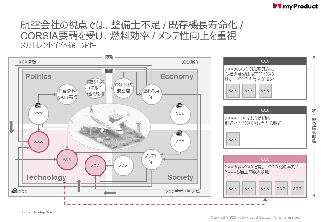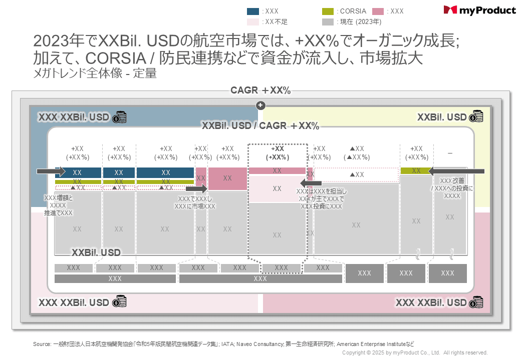 戦後の産業解体を経ても、日本の航空機産業は裾野の広さを維持し、欧米との協業を通じて独自のサプライチェーンを形成。近年、防衛分野では無人機やサイバー技術の進展に伴い、防民連携が加速し、防衛から民間領域への資金流入の兆し。加えて、CORSIAをはじめとする脱炭素化の国際的潮流、航空整備士の人材不足、OEMによる新造機の納入遅延といった課題が、新たな投資や事業機会を生む背景に。本検討では、こうした外部環境を網羅的に整理し、複数のメガトレンドを踏まえて将来的に成長が見込まれるセグメントを特定し、自社のアセットとノウハウを活用した中期的な事業創出アプローチを提示。今後は新組織の立ち上げを経て、本格的な事業検討フェーズに移行。