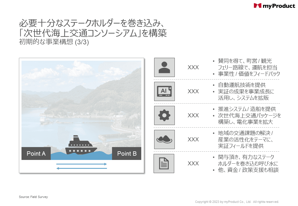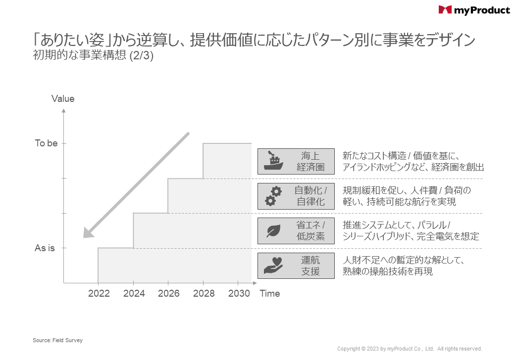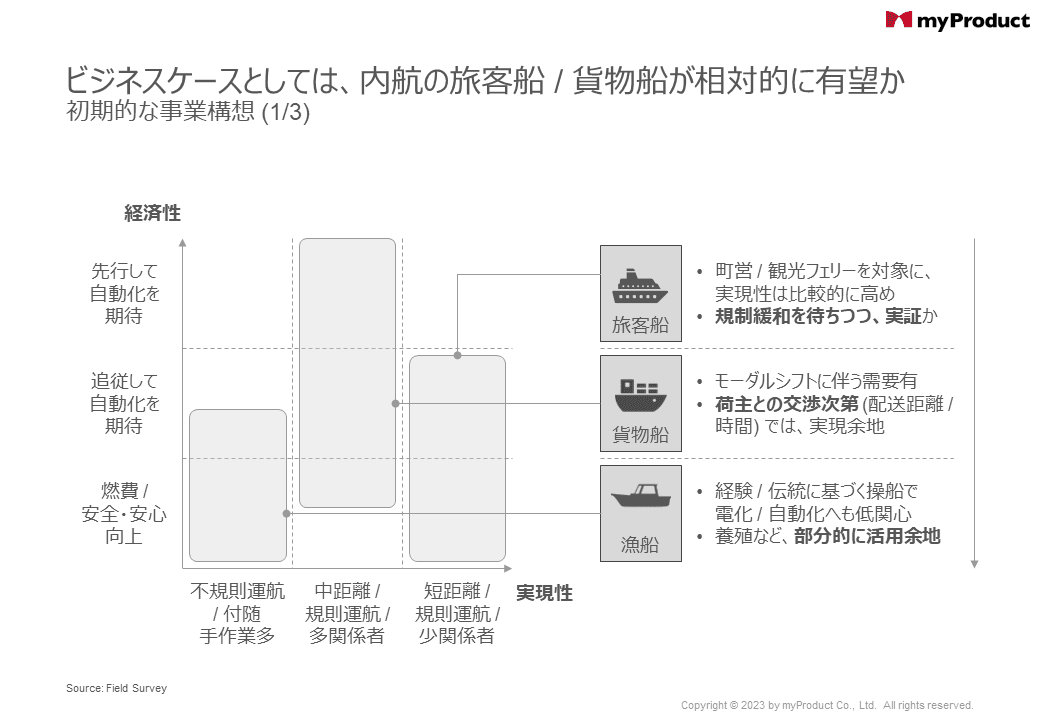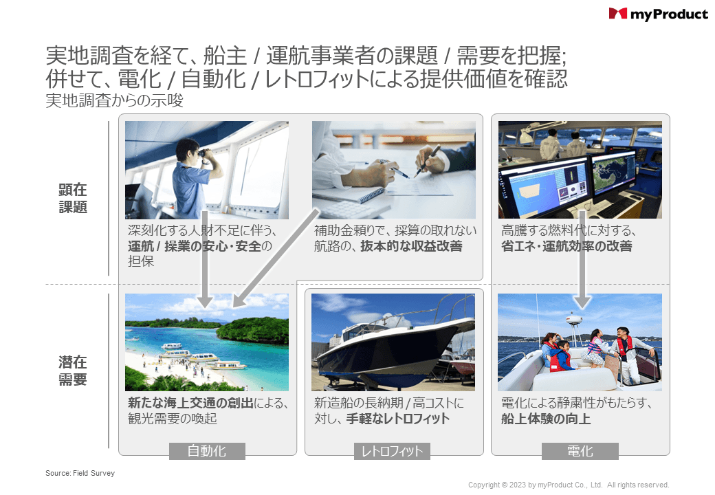 水上モビリティの自律化を通じて、島嶼地域の課題解決、そして新たな海上経済圏の創出を目指す、株式会社エイトノットとの共創プロジェクト。船の自動運転技術を社会に実装し、海上交通の規制緩和を加速するべく、船舶と接点を持つ大手製造メーカーとの協業を提案。関係者を招き、船主 / 運航事業者 / 官公庁との面談、実験機への搭乗を通じて、自動化と電化、レトロフィットを組合せた、より包括的な事業構想を策定し、協業実現に向けた議論を具体化。