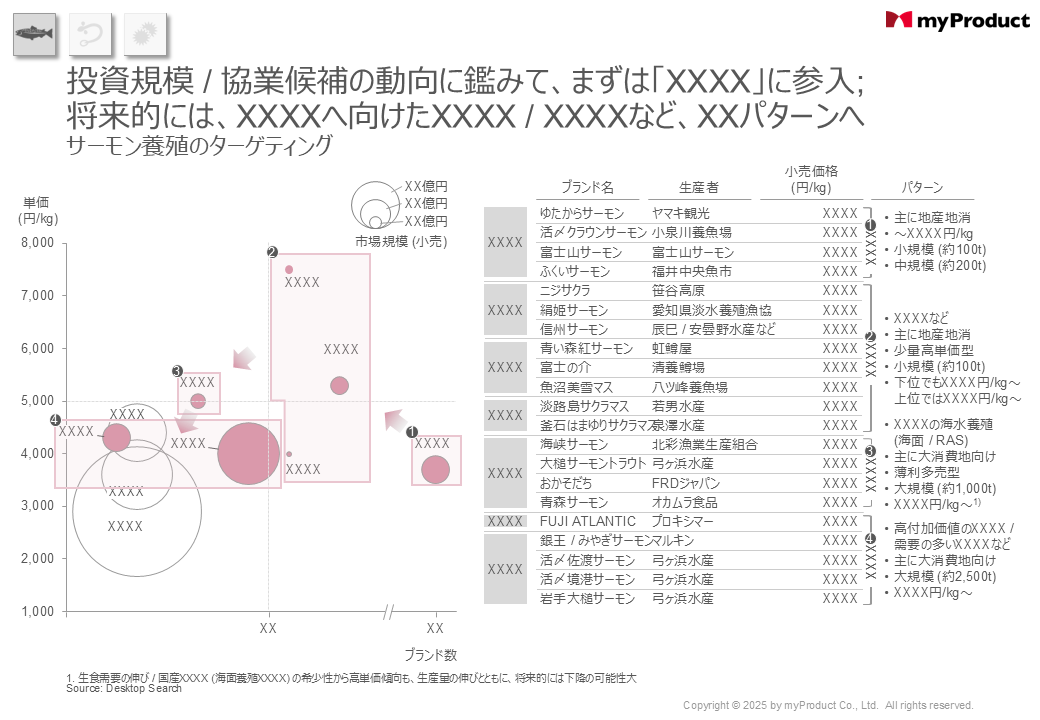 地域に根差した電力会社において、従来の電力の安定供給に加え、地域の活性化に資する電力の需要創出を通じた、新たな成長ストーリーの検討が進行中。本検討では、一つの事業アイデアである「陸上養殖」について、参入シナリオの検討と協業先の探索を伴走支援。検討を通じて、事業としての陸上養殖がまだ技術的に未成熟で、各社いずれも黒字化に苦戦している現状を把握。その上で、養殖する魚種 / 規模 / 方式や、サプライチェーンの組立て / (将来的な) コスト削減の打ち手を変数に据え、黒字化可能なパターン / ステップを導出。同時に、2ヶ月間をかけて500社以上の水産事業者にアプローチし、上述のパターンを実現し得る協業先候補10社を抽出。クライアントの検討チームと接続したことで今後、共同の実証実験へ。
