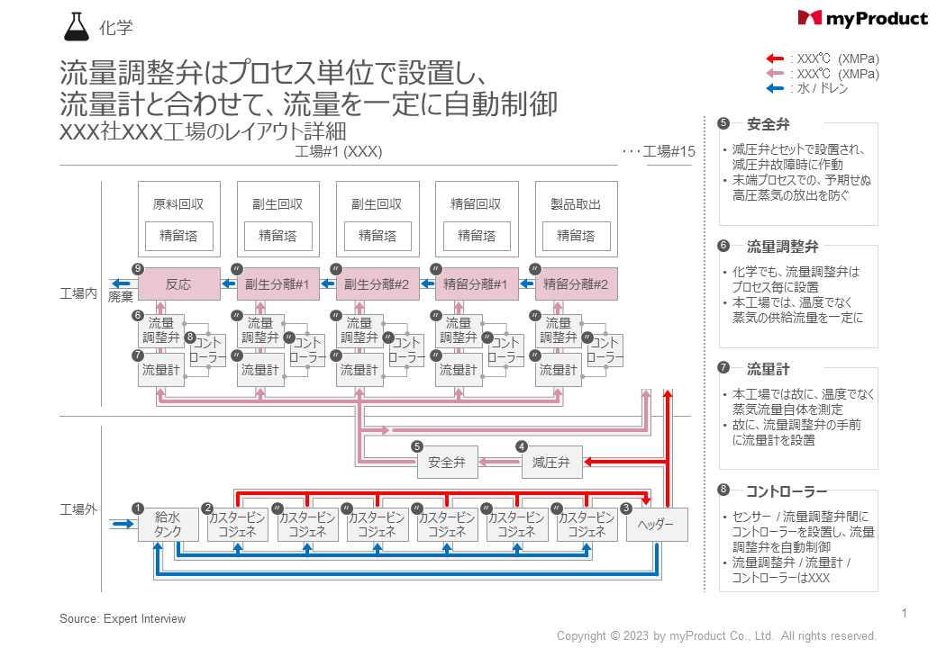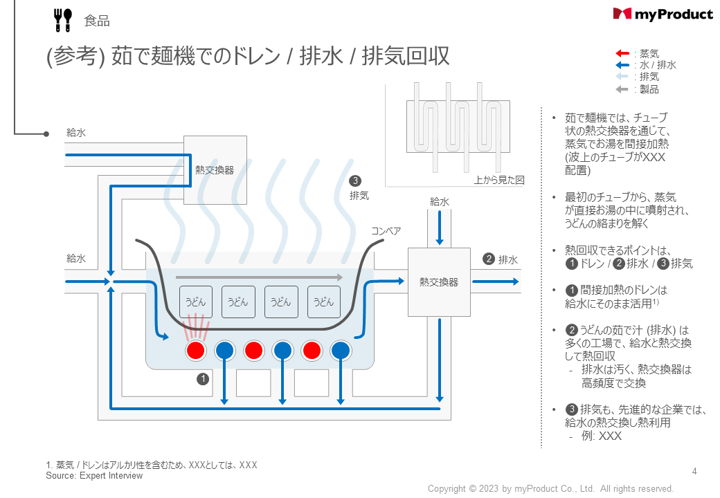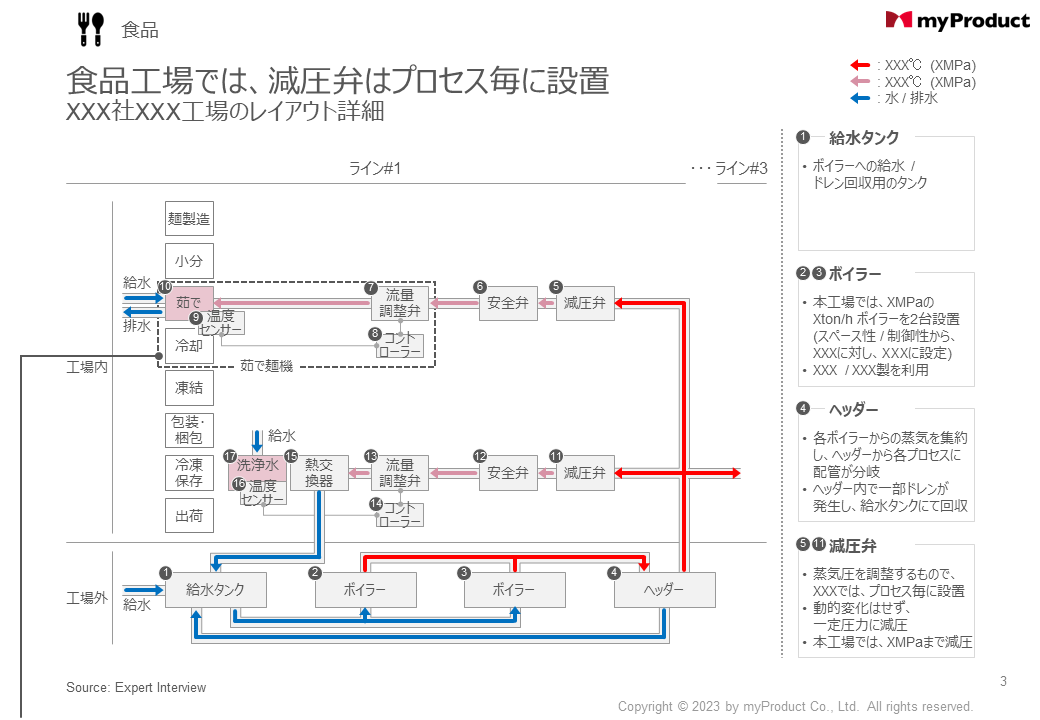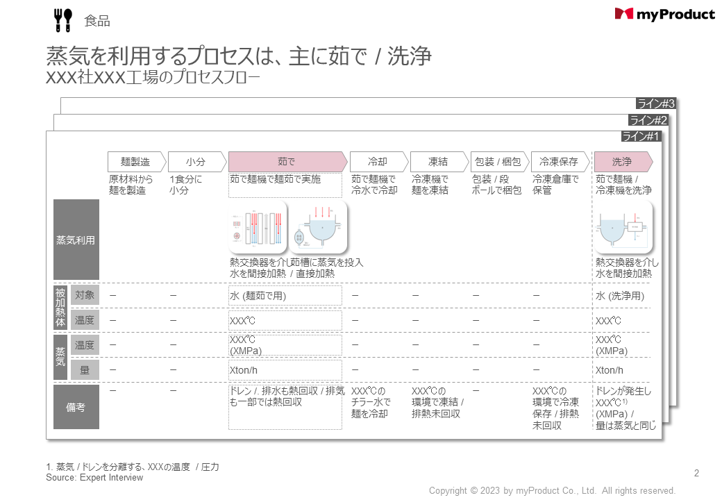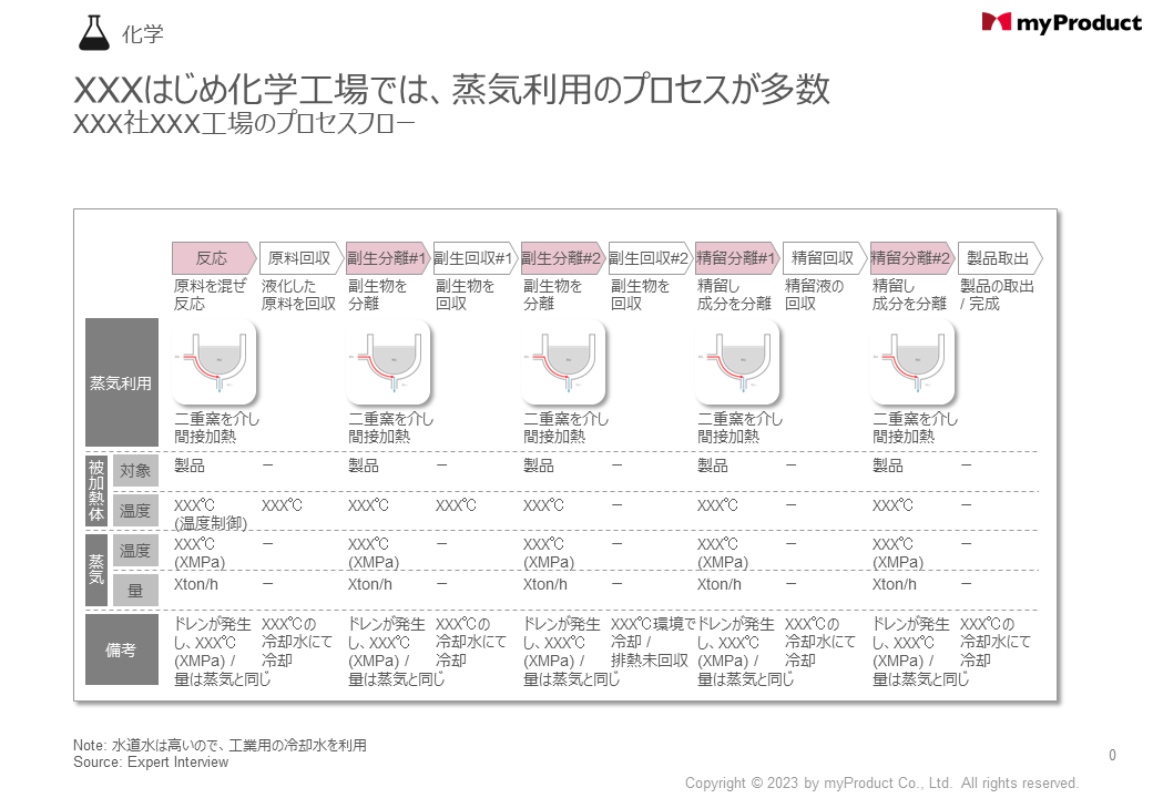 脱炭素に向け、製造業では大手を中心に、工場で使用する蒸気の生成を、化石燃料から電気に切り替えていく潮流。本プロジェクトでは、設備機器メーカーおよび複数の業界エキスパートと協働し、国内の食品 / 飲料 / 化学工場内における蒸気利用プロセス / レイアウトを精緻に分析し、どこに今後、どのような次世代設備が導入し得るのか、外すべき制約条件は何か、を検討。1ヶ月間の検討を経て、有望な設備 / 導入パターンを把握し、具体的なスペック / 顧客・市場価値の分析フェーズへ。