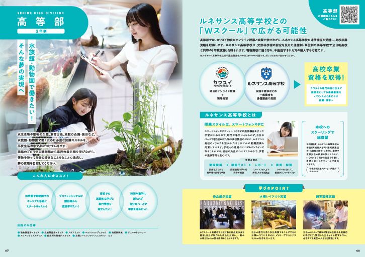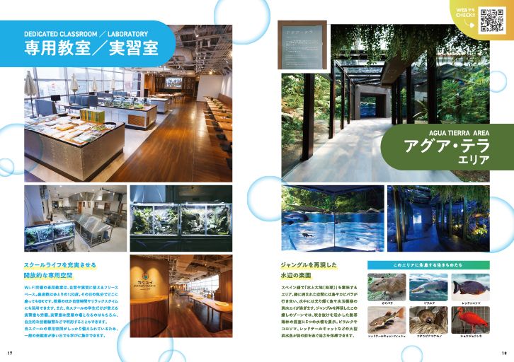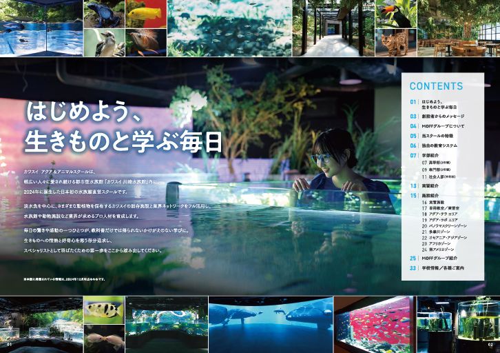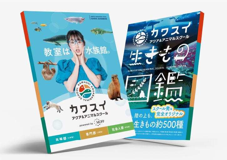 日本初の水族館直営の学校「カワスイ アクア&アニマルスクール」向けに、学校案内として、カワスイが保有する約500種の生きものを一冊にまとめた完全オリジナル冊子を企画 / 制作。ビジュアルだけではなく、特徴 / 生息地 / 食性など、水族館や学生ならではの視点で魅力を訴求。生態をめぐる楽しみと発見、カワスイの生きものへの愛と情熱が詰まった一冊に仕上げ。