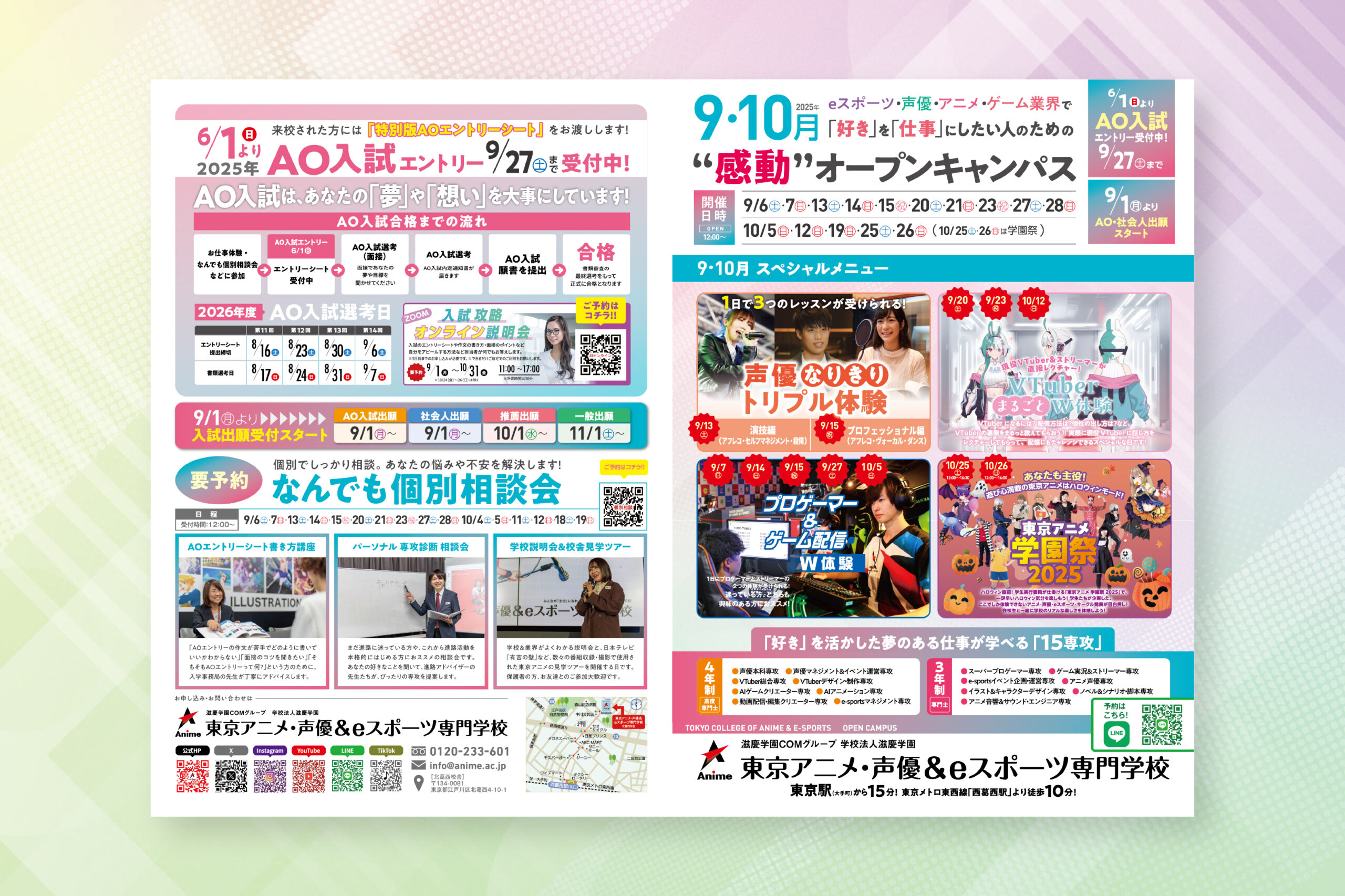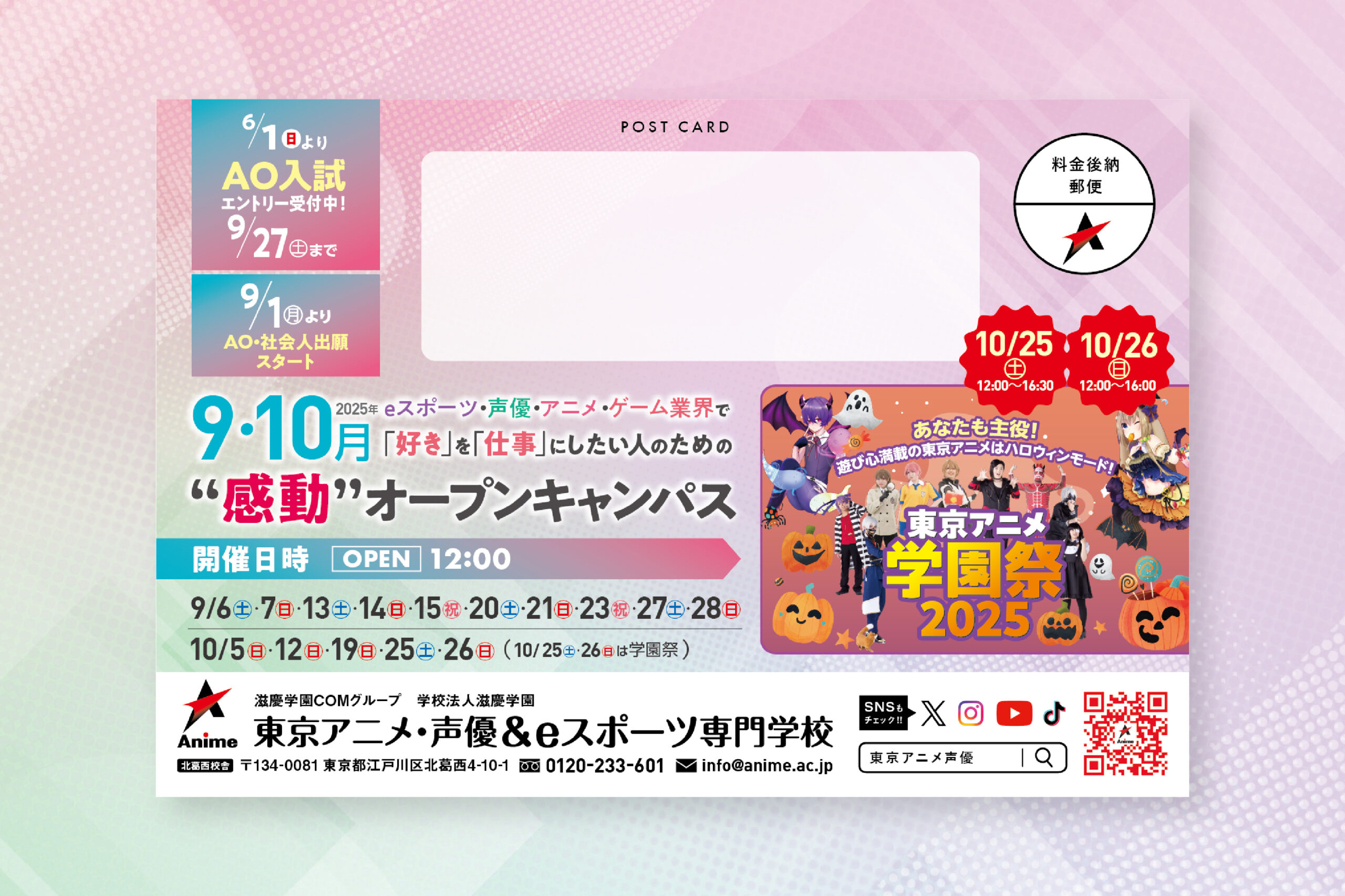 入学検討者の来校機会最大化と進路決定率向上を目的とした、集客ツールを制作。多彩な実践型職業体験プログラムを一覧化し、進路選択の幅と体験価値を明確化することで、ターゲット層の興味を喚起。DMによる早期認知とイベント直前ハガキによる再認知を組み合わせた段階的な接点設計により、集客効果を向上。また、入試申込時期に合わせた学園祭の開催により、来校 / 体験を入学意思決定の最終トリガーとすることで、応募者数増加とブランド価値向上の双方を実現。