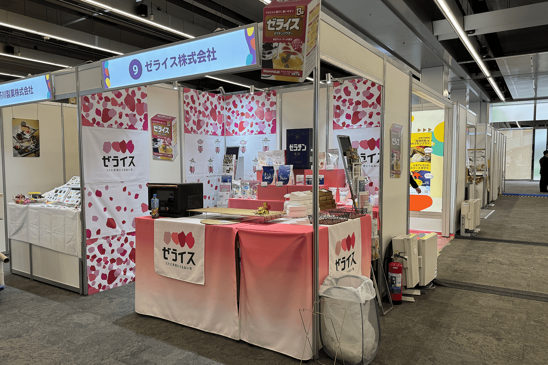 ゼラチン / コラーゲンペプチドの製造および販売を手掛ける、ゼライス株式会社のコーポレートVIの定着課題に対して、商談展示会ブース向けのVIキットを企画 / 制作。設置空間のサイズや環境が異なる商談展示会において、可変的に運用できる仕様にデザイン。遠方地での展開も考慮に入れた運搬サイズや、各設置担当者の属人的なセンスに依存しない点にも配慮。