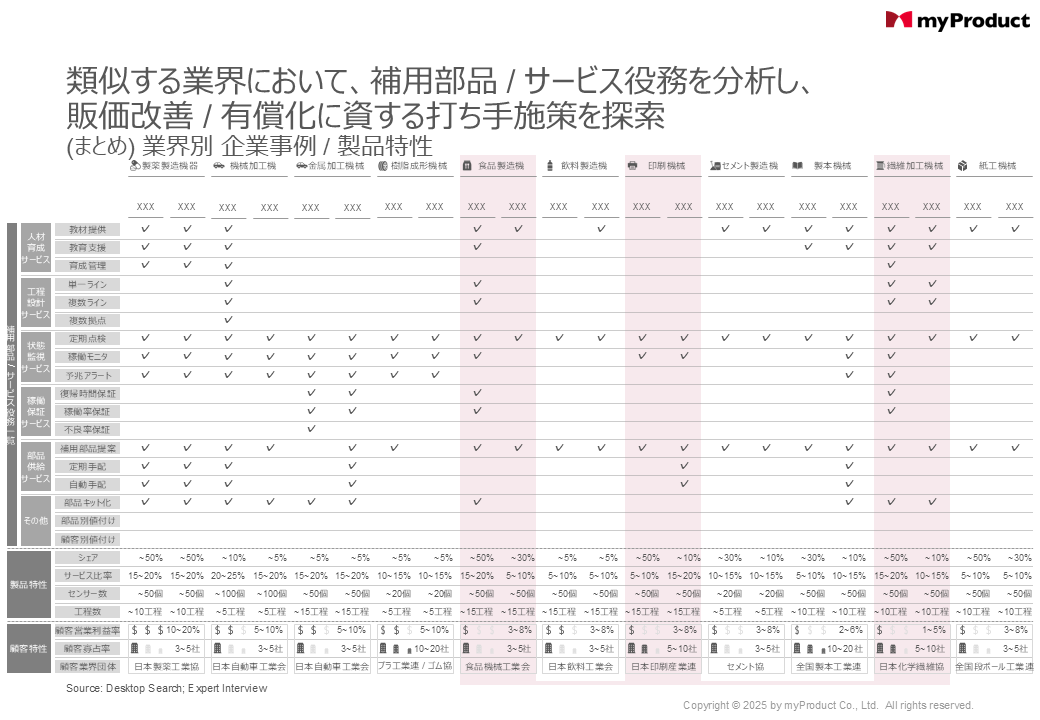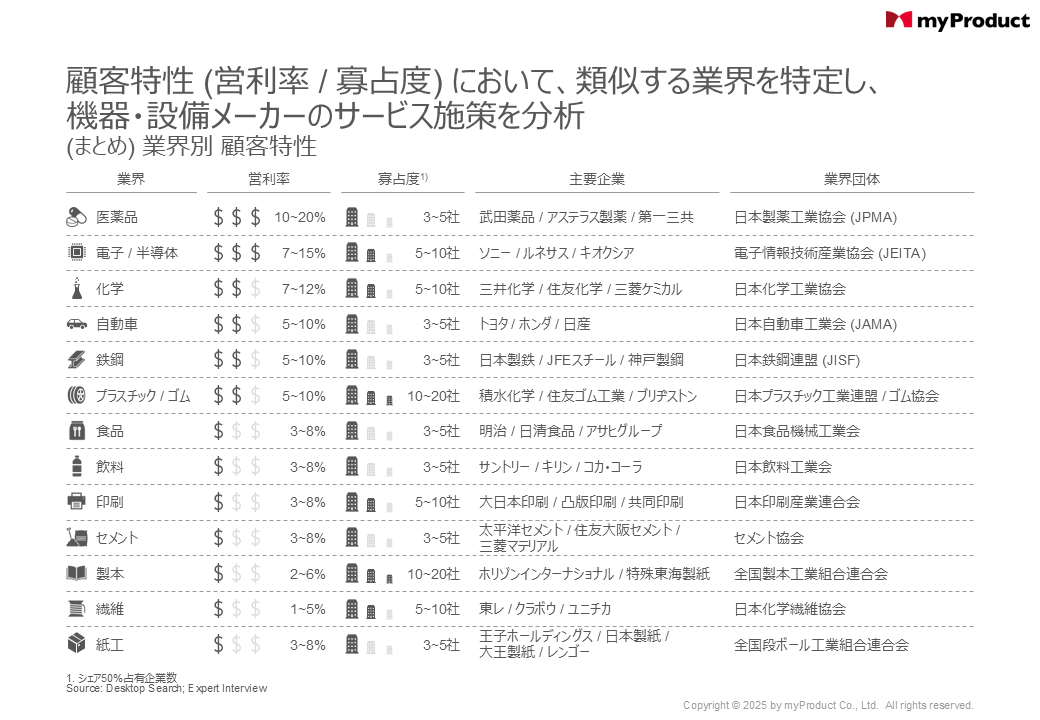 グローバルな加工機械業界では、環境対応やデジタル化の潮流を背景に、製造・サービス一体型の事業モデルが進展。一部の国内メーカーでは、サービス提供の高度化や部品供給体制の強化が進む一方で、従来の価格体系ではコスト吸収が難しくなっており、サービス事業の価値を的確に反映した販価設計・交渉戦略の検討が急務。本検討では、クライアントと類似する顧客特性 / 製品特性を持つ複数の業界からベストプラクティスを抽出し、自らに置き換えた場合の打ち手仮説を導出。併せて、各打ち手について、業界団体など、ステークホルダーとの利害調整を意識した実現可能性を評価。