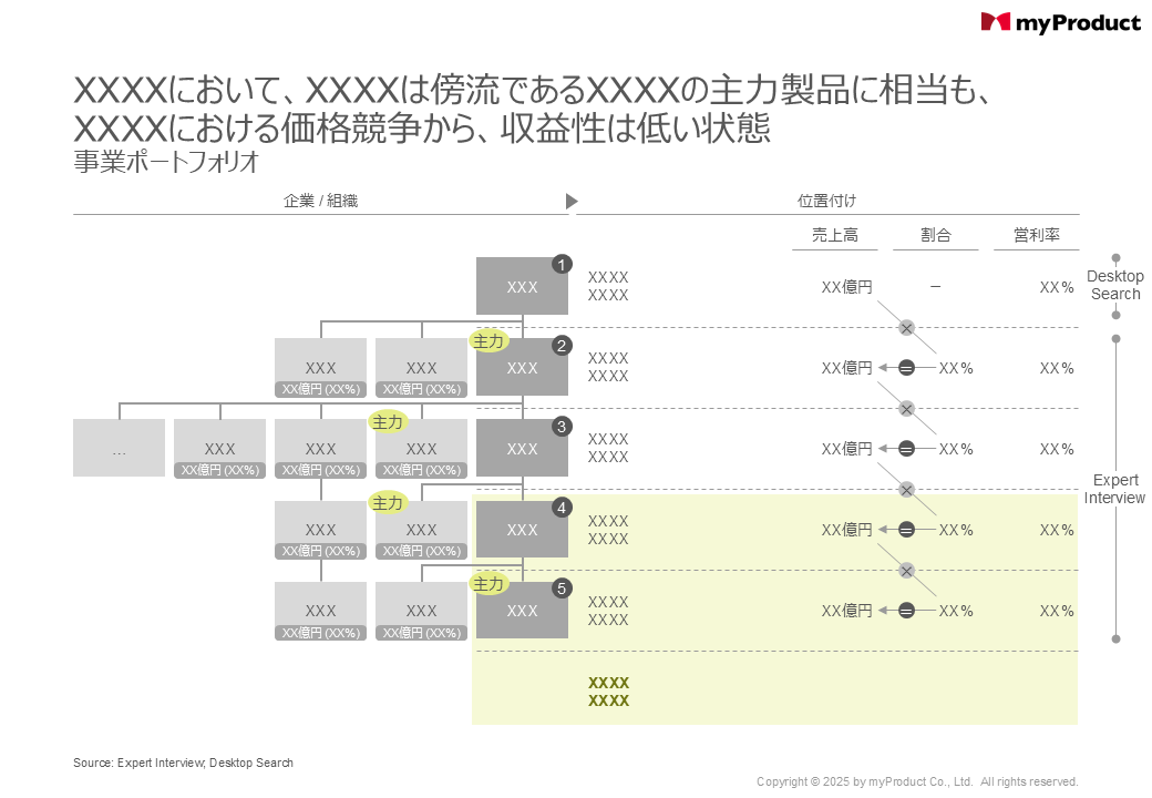 対象の大型舶用機器市場では、燃料転換 / 安全保障を背景に市場トレンドは上向きも、メーカー間の優勝劣敗が進行。本検討では、新製品の開発・拡販を目論む機器メーカーの、顧客・競合に対するマーケティング活動を支援。主要な顧客・競合を対象に、約10社の事業・収益構造 / 製品開発動向 / 販売・サービス戦略を分析。エキスパートインタビューを通じて、各社の経営 / 現場課題を抽出しつつ、機器単位での「モノ売り」から、顧客 (ライフサイクル) 単位での「コト売り」へと、戦い方の変化に対する共通認識・危機意識を醸成。最終的に、勝算の高いターゲット顧客を特定し、参入アプローチを可視化した上で、業界の変化点を踏まえた販売戦略を提言。