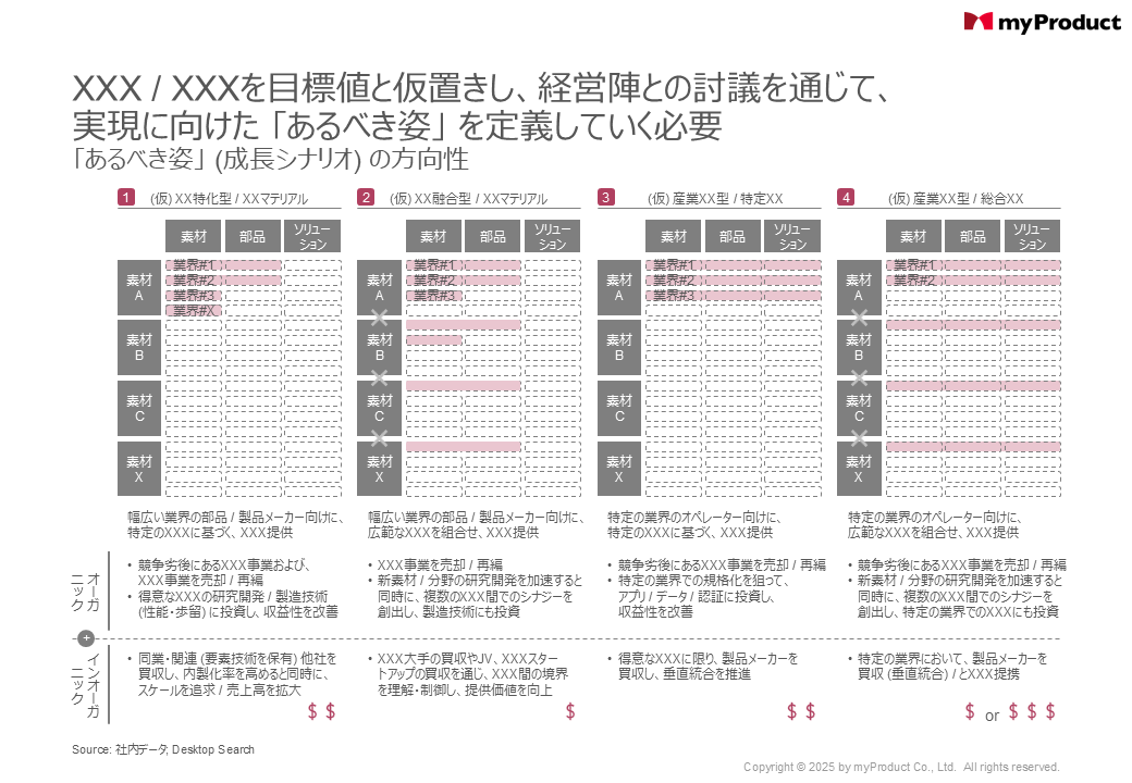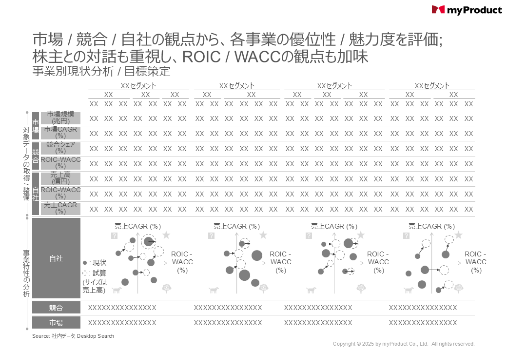 創業者の引退後、経営アジェンダに関する意思決定機能の低下を課題とする大手電子部品・電気機器メーカー向けに、事業別ROIC / 事業ポートフォリオ経営の導入・自走化を支援。同社は、競争優位性の高い素材・技術を起点に、多様な製品・サービスへと事業を拡大するも、近年は各事業でアジア勢 (中国 / 韓国 / 台湾) との価格競争が激化。全社戦略が曖昧な中、投資家からの圧力も高まっており、多角化した事業の再構築および資金最適化が急務。本検討では、経営陣 / 経営管理部門と共に、市場 / 競合 / 自社 / 株主 (ROIC / WACC) の視点を踏まえたポートフォリオ管理体系を設計し、その体系に基づき現状 / 目標を整理すると同時に、「あるべき姿」の欠如について指摘。後続フェーズでは経営陣を中心に、部門間の矛盾を乗り越えた全社単位の「あるべき姿」と、そこに向けた「フィット・ギャップ」について、集中的な討議を予定。