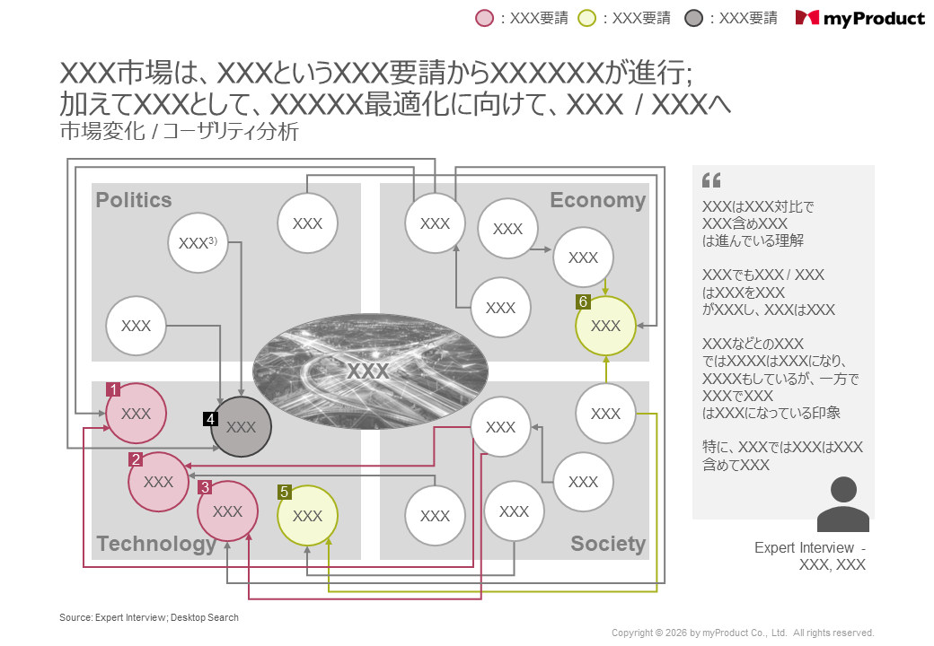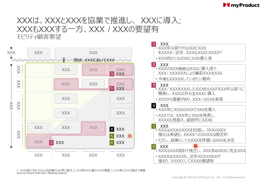 船舶・航空機・鉄道など大型モビリティにおいては、整備・点検の人材不足により、メンテ性能向上に向けた電動化 / 予知保全 / 材料転換が進行。同時に、地政学リスクの高まりが常態化し、OEM各社はサプライチェーンの多層化を模索。本検討では機種を跨いだ汎用性の高い特定コンポーネントについて、国内外有識者へのヒアリングを重ね、材料・技術およびサプライチェーンに関する主要OEMの課題・要望の差異を、十数個の材料・部品レベルまでブレークダウンし、明確化。国内の複数サプライヤー (Tier1 ~ Tier3) に対して、今後の開発ロードマップ策定に向けた示唆を提供。