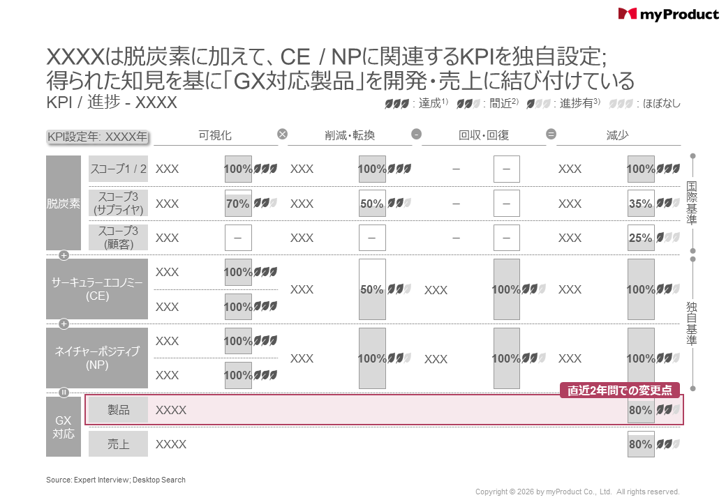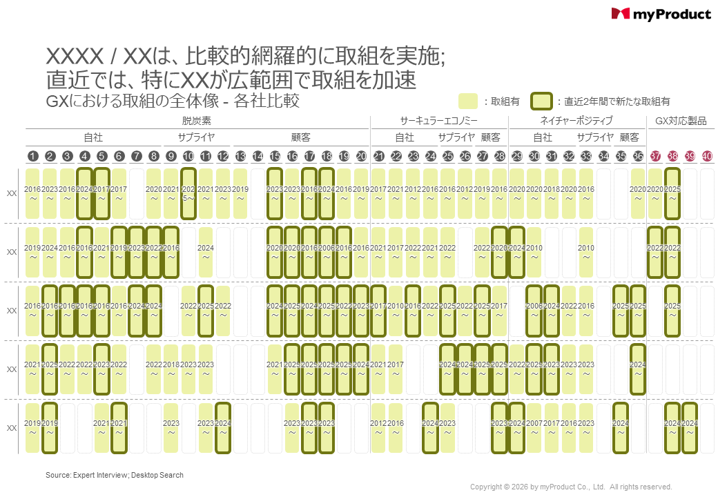 大手電機メーカーのGX戦略策定において、地政学的な揺り戻しを踏まえ、脱炭素に閉じない、資源循環 / 生物多様性を含むサステナビリティ起点への軌道修正を伴走支援。競合各社が推進する多様な取組を「リスク・規制対応 (守り)」と「成長機会創出 (攻め)」の観点で計40項目へ類型化。併せて、各取組の着手時期 / 拡張推移を時系列で整理し、戦略の変遷および競争ポジションを可視化。「GX対応製品・ソリューション」を対象に、上記の競合動向 / 競争優位性を踏まえ、自社として今後検討すべき戦略論点を提示。