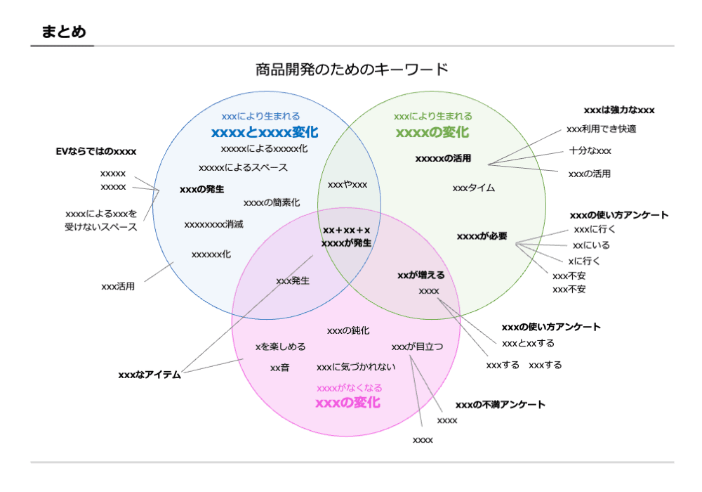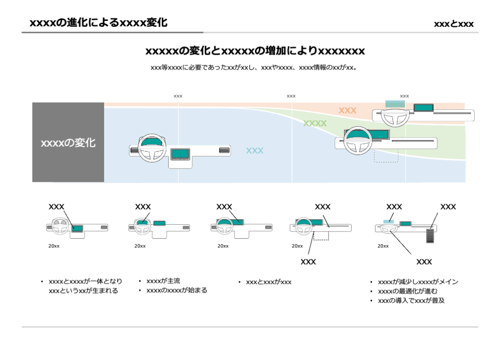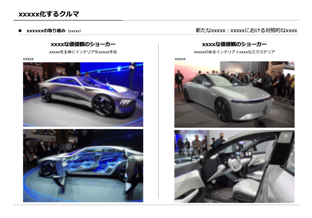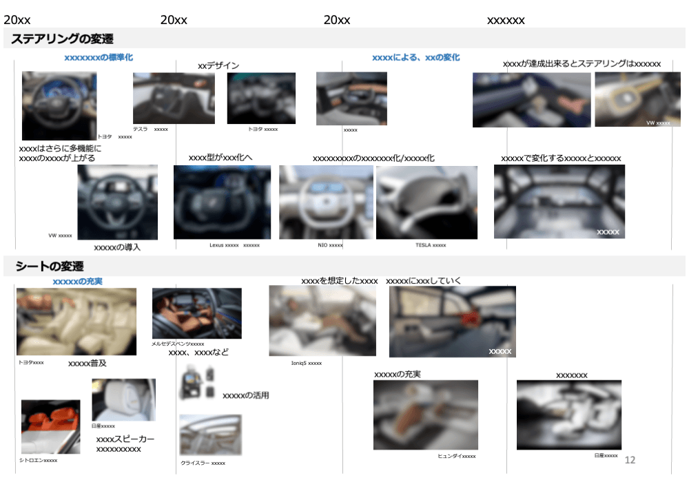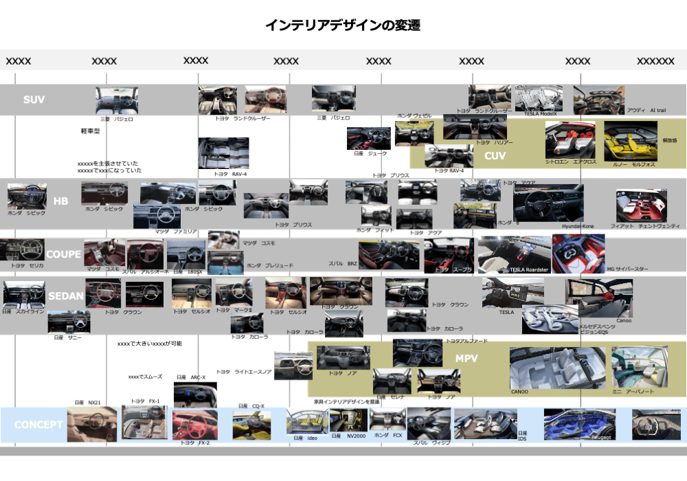 加速する自動車のEVシフトにおいて、既存のICEと比べ、車体構造や使用シーンの多様化が進行。こうした、脅威と機会が混在する転換点において、大手自動車用品メーカーと、新たな商品企画に向けた調査を実施。現車調査および海外視察で得た最新情報に加え、歴史を紐解きつつ、自動車インテリアデザインの変遷を年表形式で取りまとめ。一連の調査をベースに、今後のEVシフトで起こり得るUX上の変化を、商品開発のためのキーワードとして抽出。本調査結果を基に、メーカーではアイデア発想のフェーズへ。
