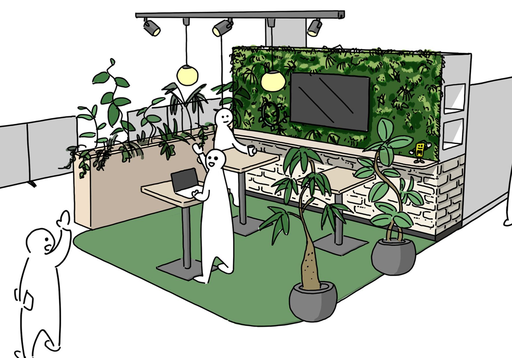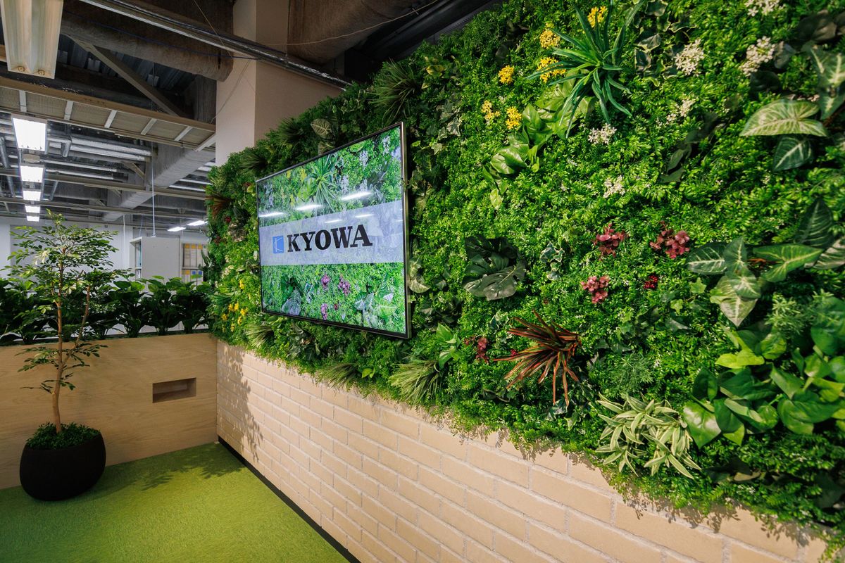 株式会社共和電業の本社棟内技術フロアにおける従業員交流スペースのリニューアルにあたり、基本設計から施工監修までを実施。「技術者同士が気軽に交流し易いスペースにしたい」との要望に対して、雑談からミーティングまで、交流のスタイルに合わせたレイアウトを幅広く提案。クライアントとの議論を経て、植栽によって執務エリアとの視線を緩やかに仕切りつつ、フレキシブルに使える空間を基本構成として設定。意匠面においては「リラックス × リフレッシュ」を基本方針として、従来のスクエアな雰囲気を一新。メインの壁面全面に植栽とブリックタイルを配置することで、屋外の気持ち良さを再現しつつ、「丸」を基調としたインテリアを導入し、日常を過ごすオフィスの中でリラックスしながら交流を促すスペースを創出。
