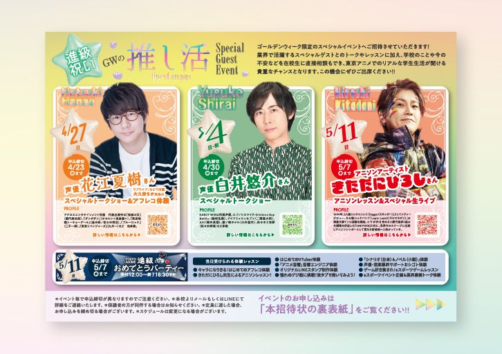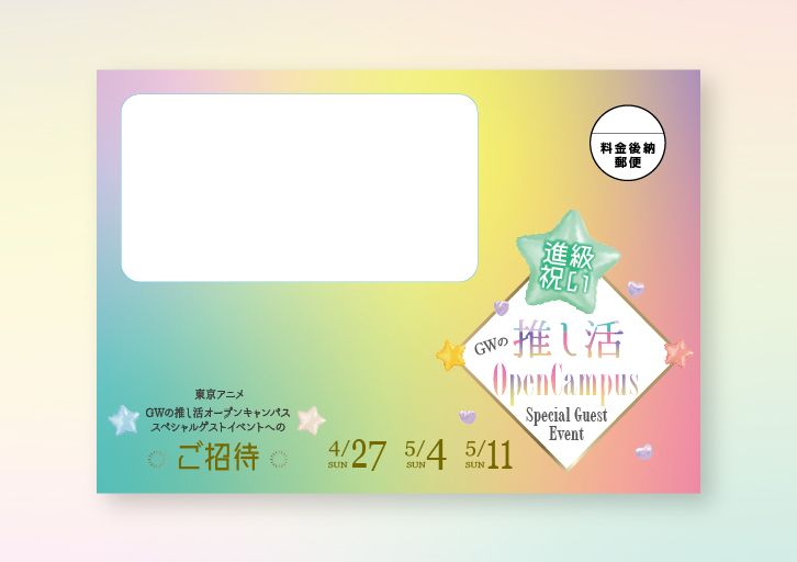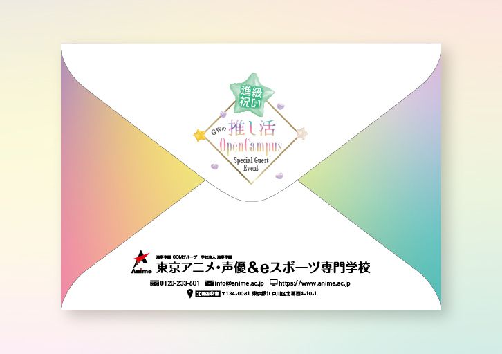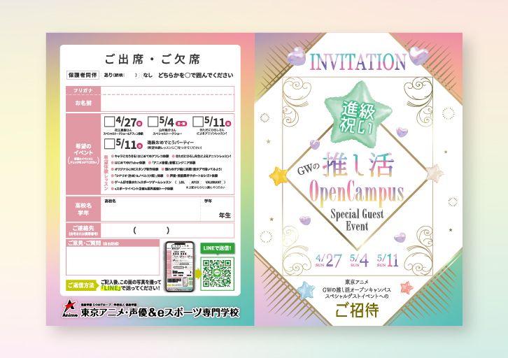アニメ・声優・eスポーツ関連の人材を育成する「東京アニメ・声優&eスポーツ専門学校」のゴールデンウィーク向けのイベントツールを制作。応募者への訴求を意識して、声優の「推し活」に振り切ったイベントに仕立てることで競合校と差別化。また、ツール持参で得られる特典も付加し、オンラインの集客では得られ難い特別感も演出。